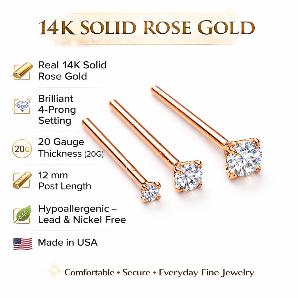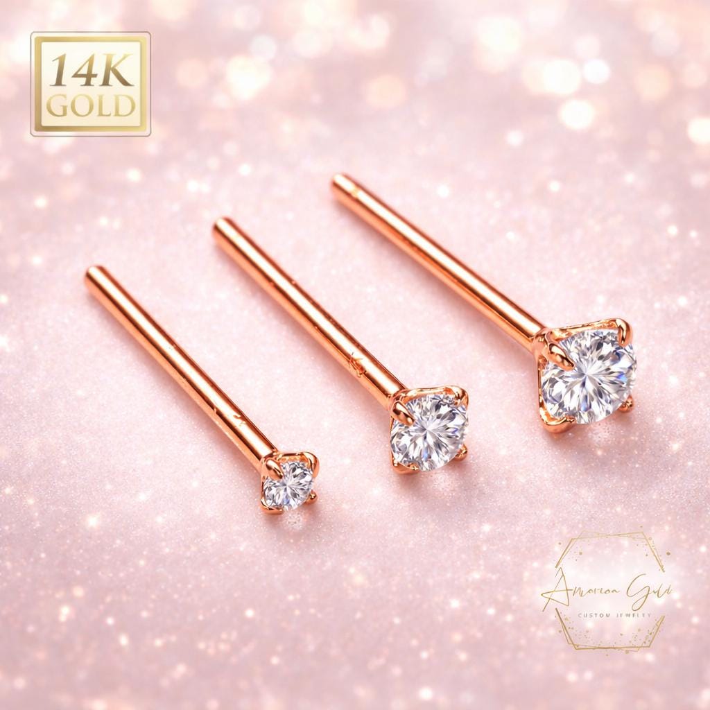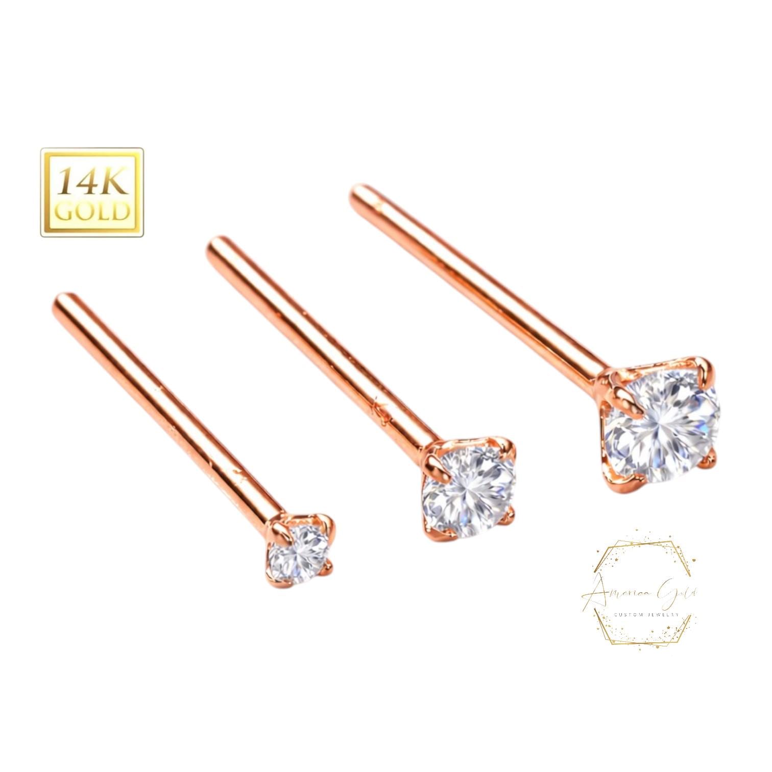 *14K Rose Gold , Straight End 12mm Nose Stud, Diamond Nose Stud, Moissanite , Lab Diamond, Nose Stud 20 GA 1.50mm-3.50mm Gemstone Nose Piercing.