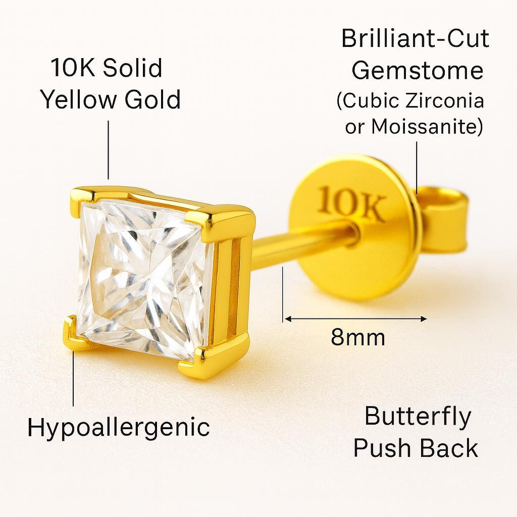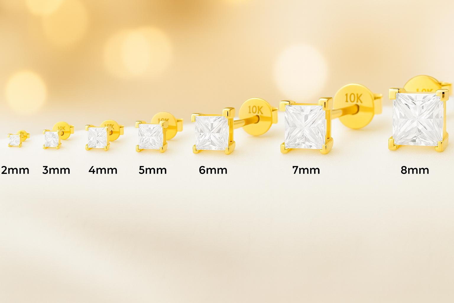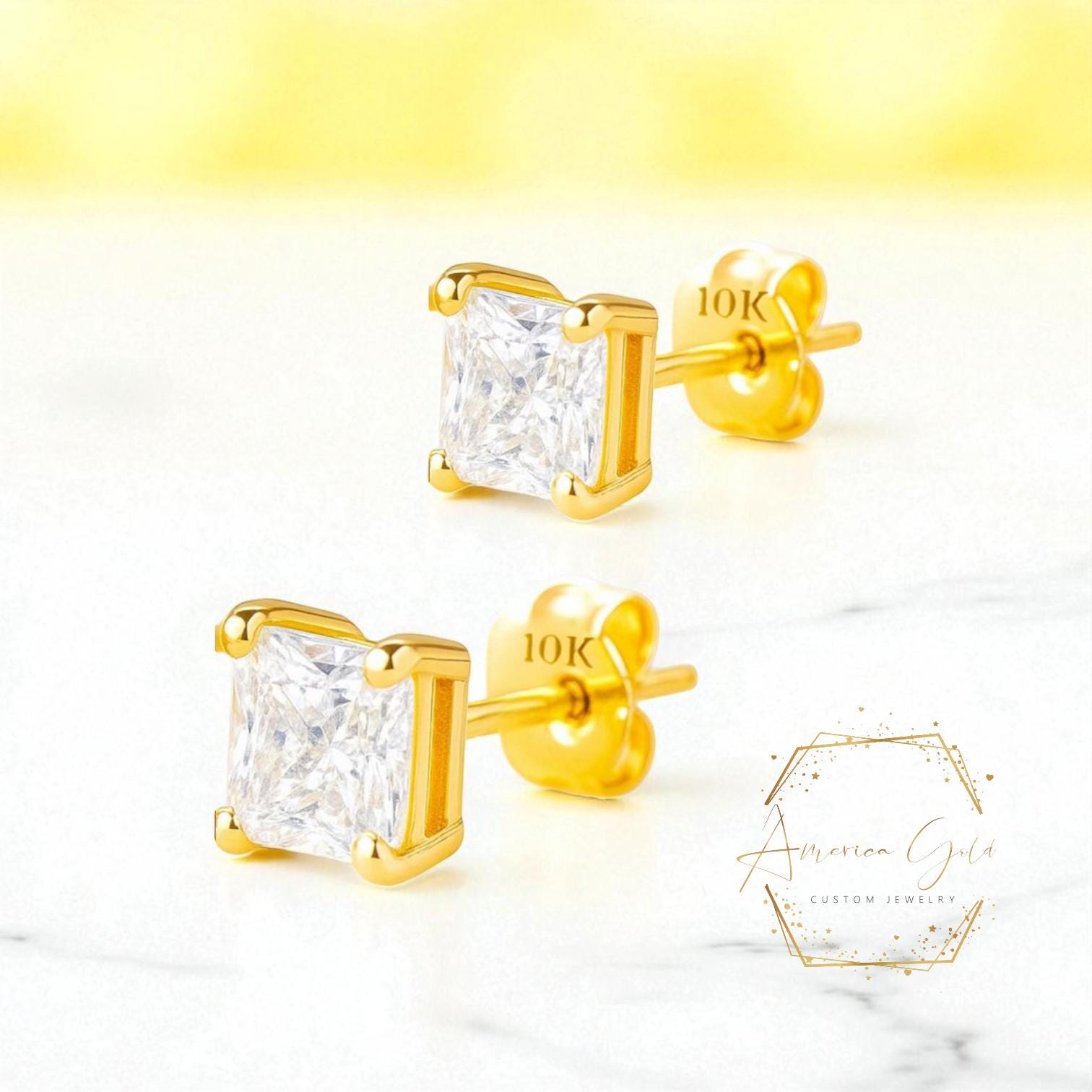 💎10K Gold Super Bright Yellow Gold Thin Post 22 GA Princess Square Cut Earring with 4 Prong Setting 3mm 4mm 5mm 6mm 7mm 8mm Option of CZ or Moissanite in Push Butterfly Back