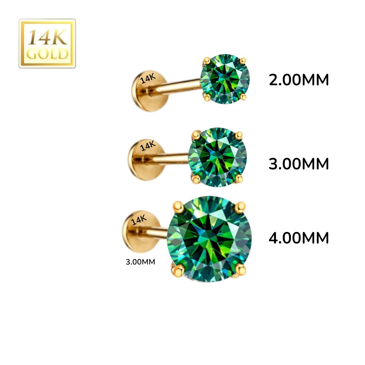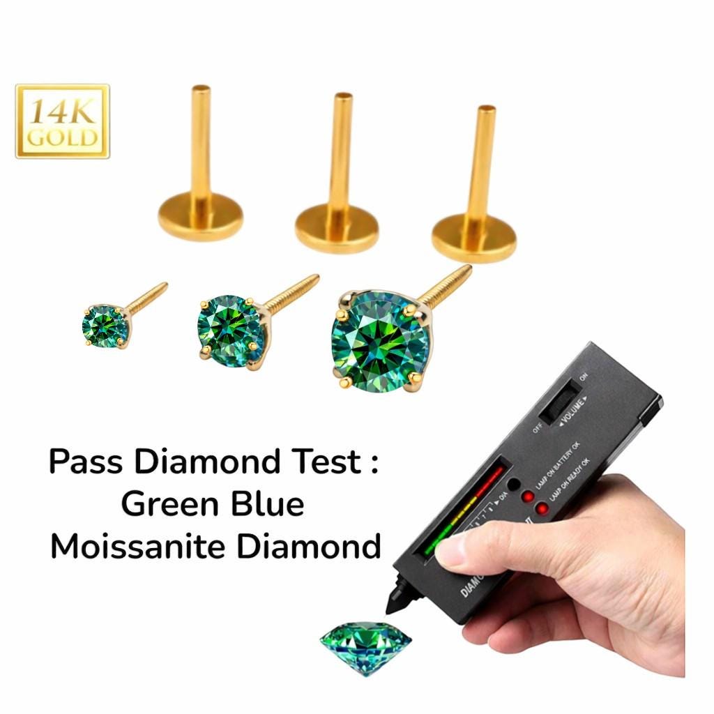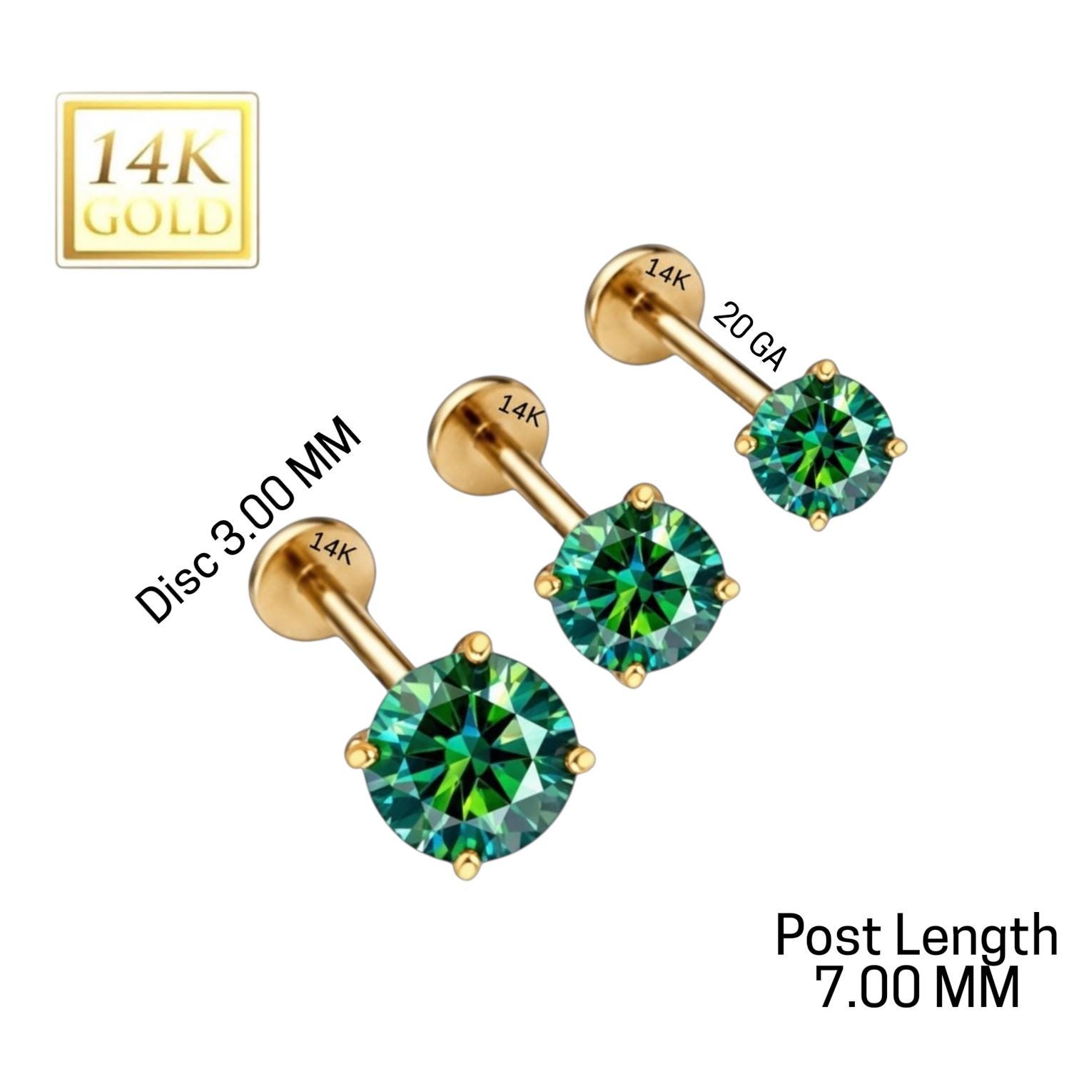 *14K Gold Internally Threaded Labret, Flat Back Stud With Prong Set CZ Top Sold 1 piece 20GA , Green Cyan Moissanite Diamond