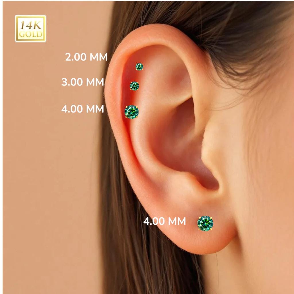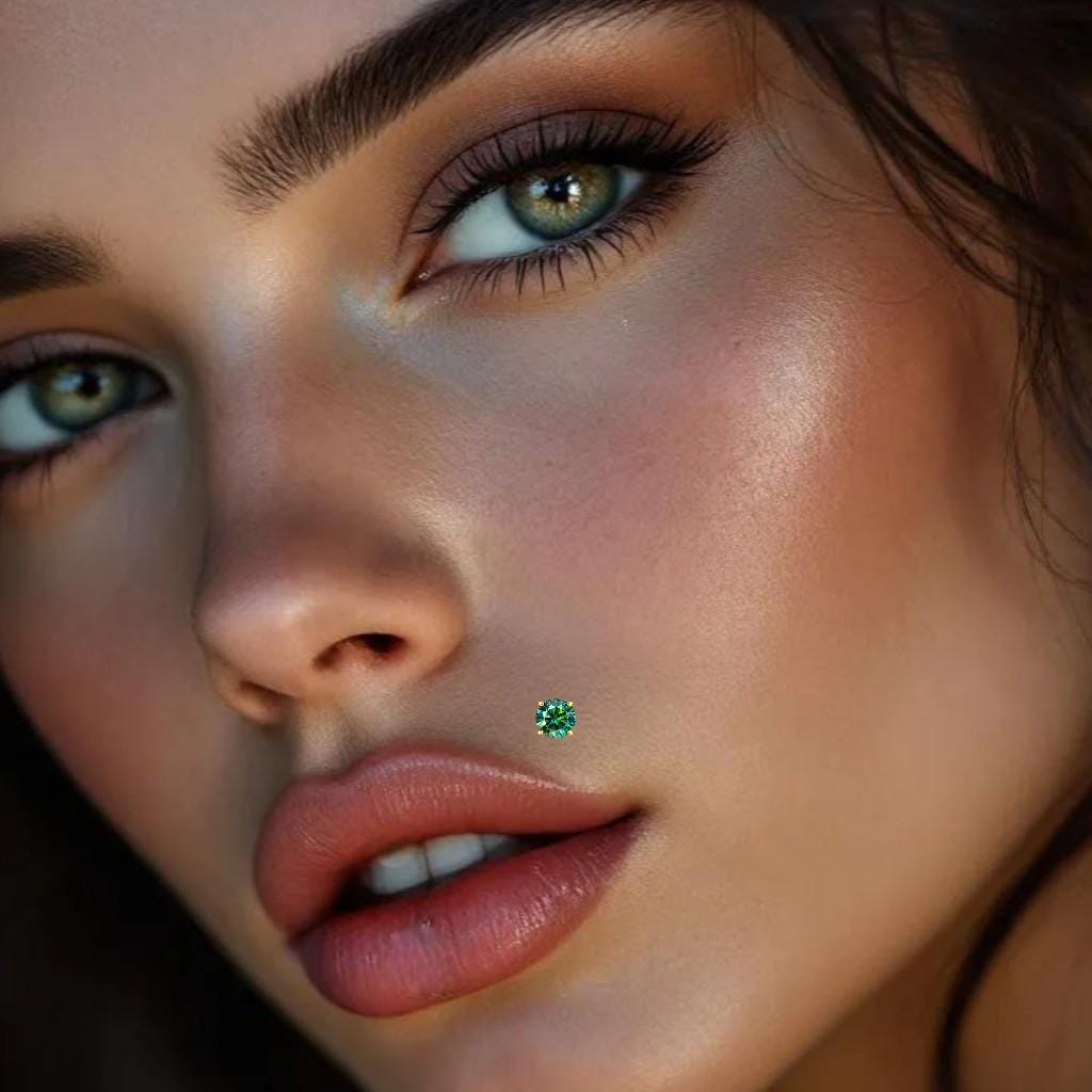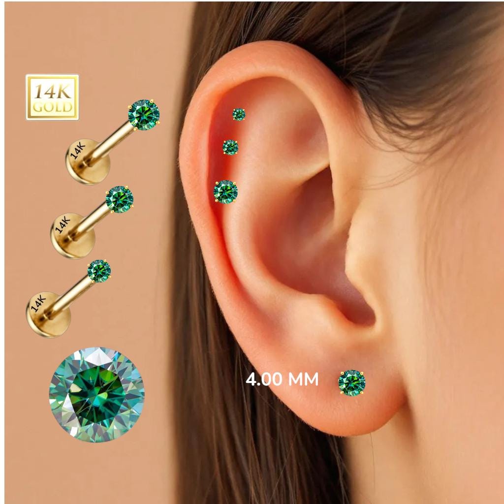 *14K Gold Internally Threaded Labret, Flat Back Stud With Prong Set CZ Top Sold 1 piece 20GA , Green Cyan Moissanite Diamond