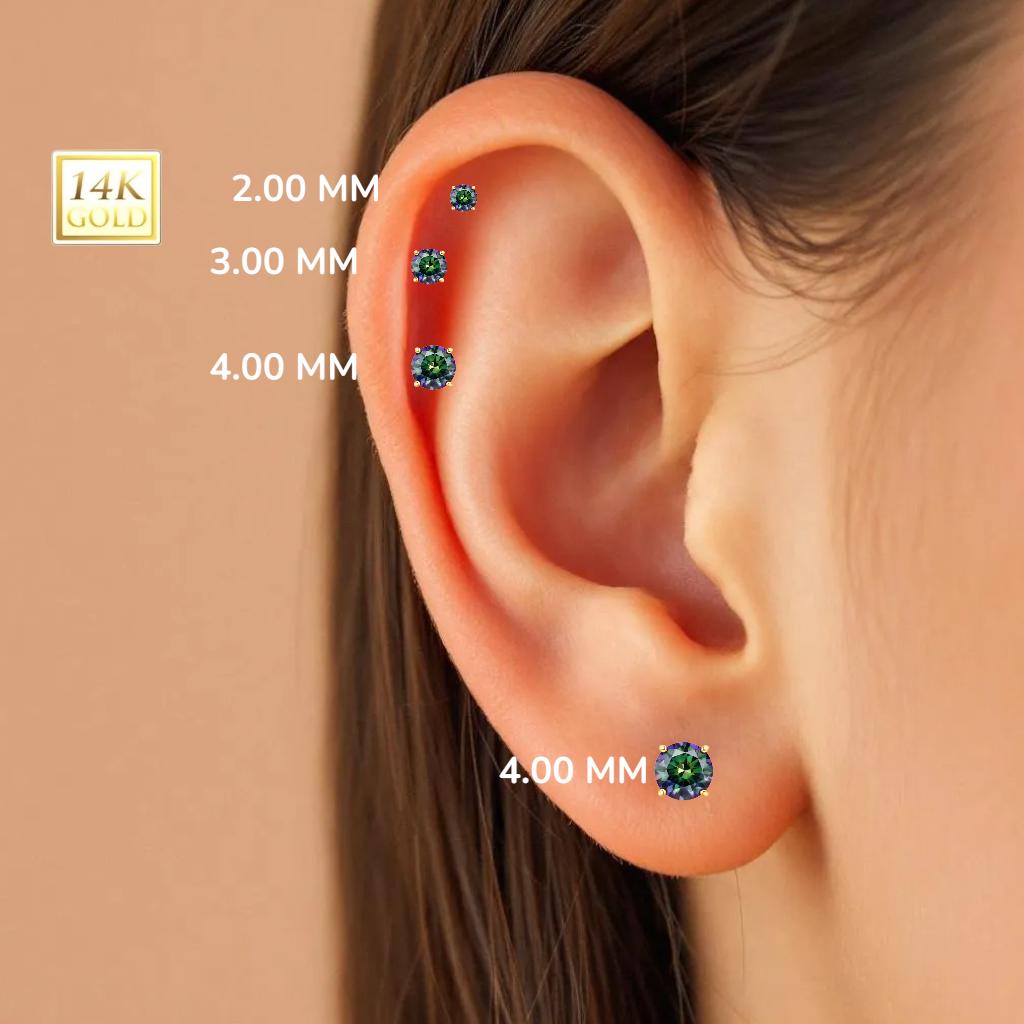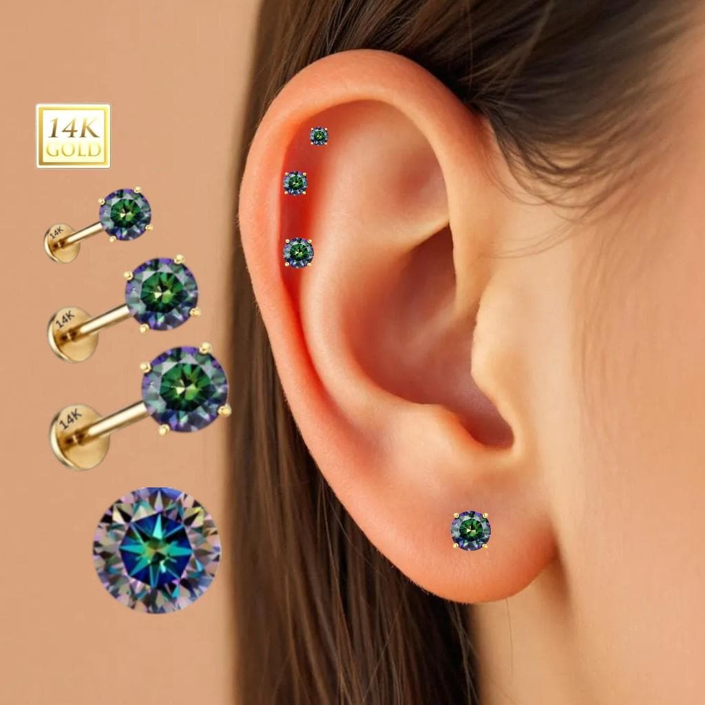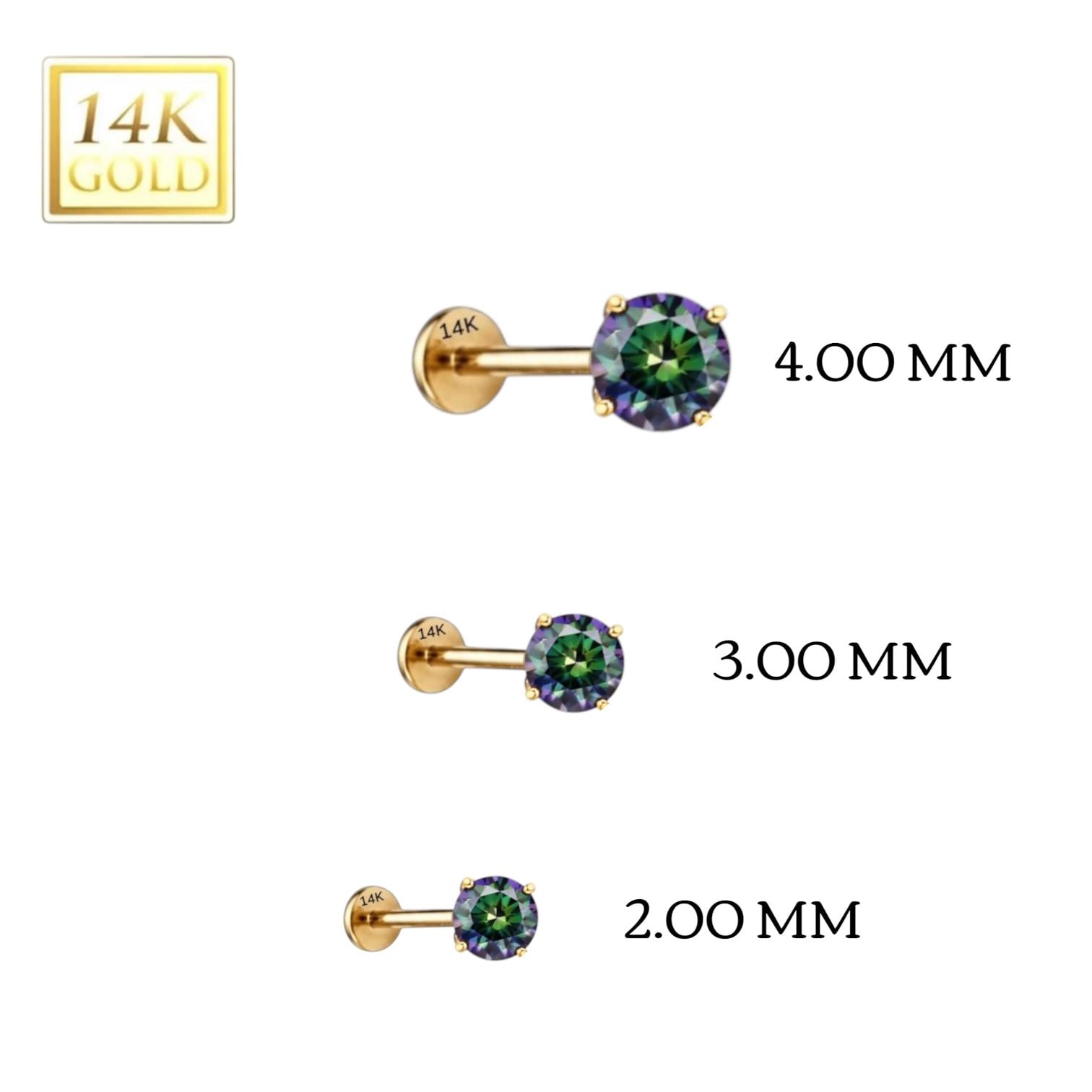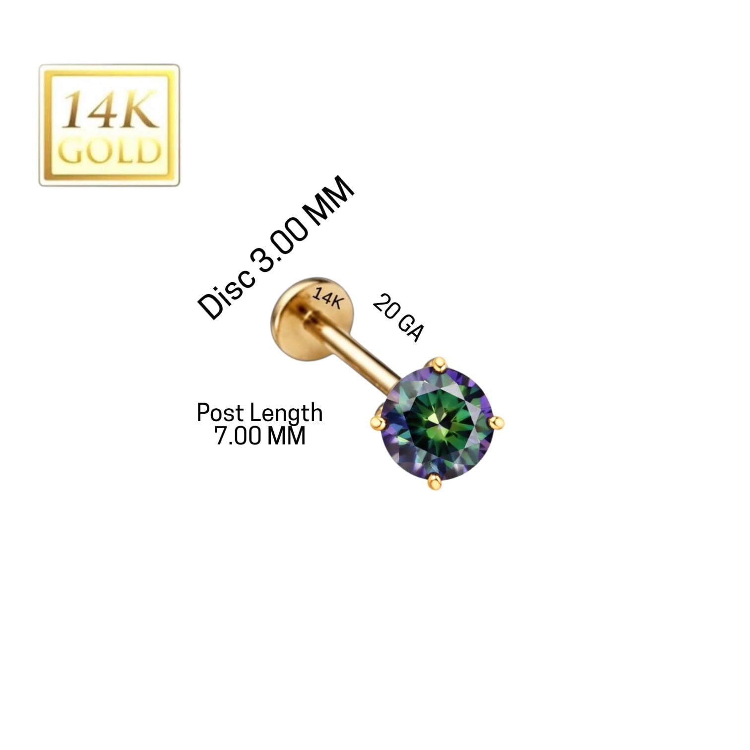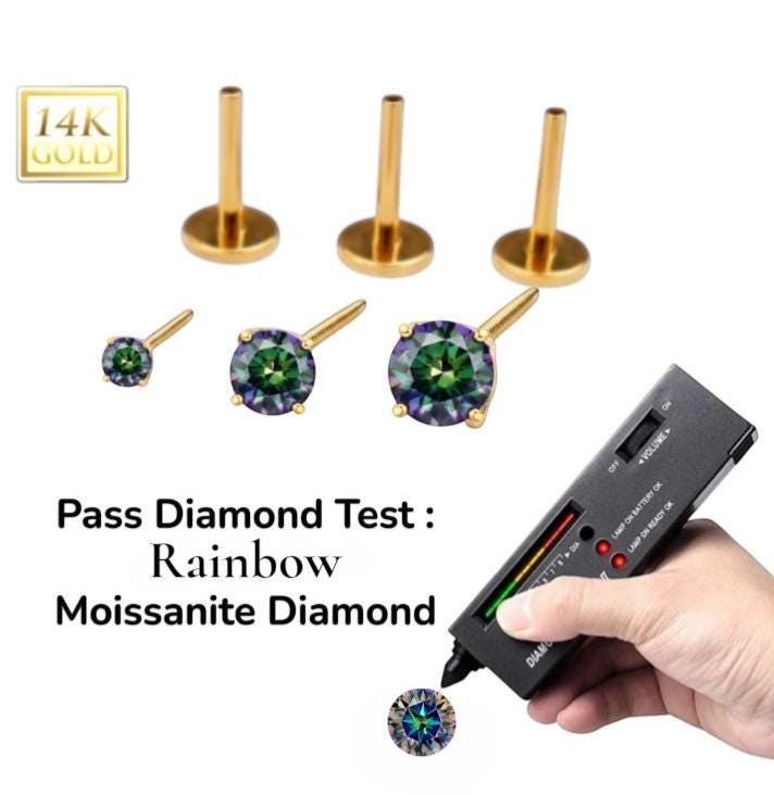 *14K Gold Internally Threaded Labret, Flat Back Stud With Prong Set CZ Top Sold 1 piece 20GA , Rainbow Moissanite Diamond