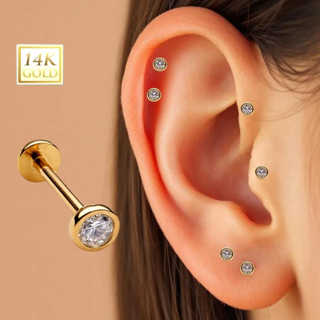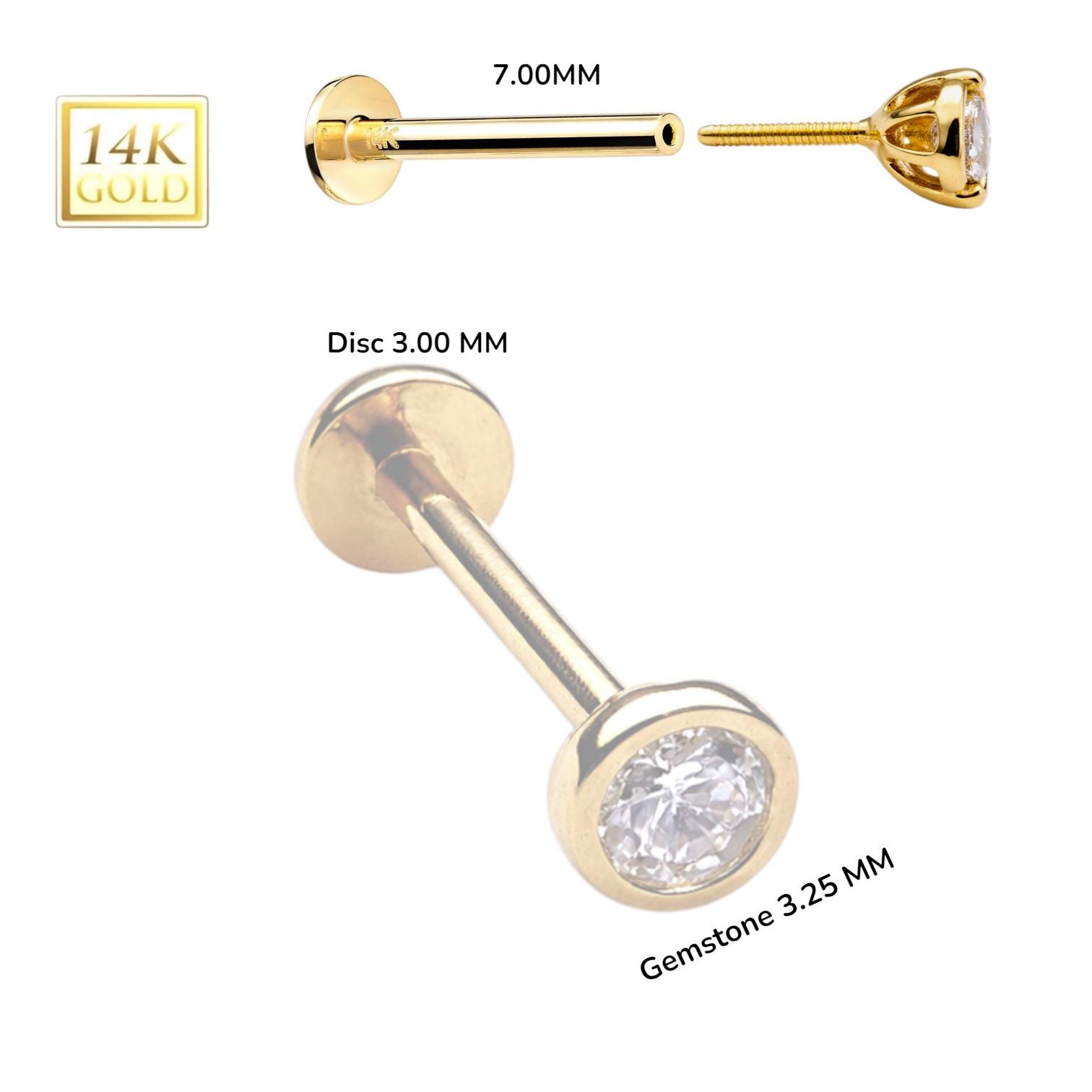 *14K Gold Internally Threaded Labret, Flat Back Stud With Bezel Cubic Zirconia Top Sold 1 piece 20GA , Select your stone.