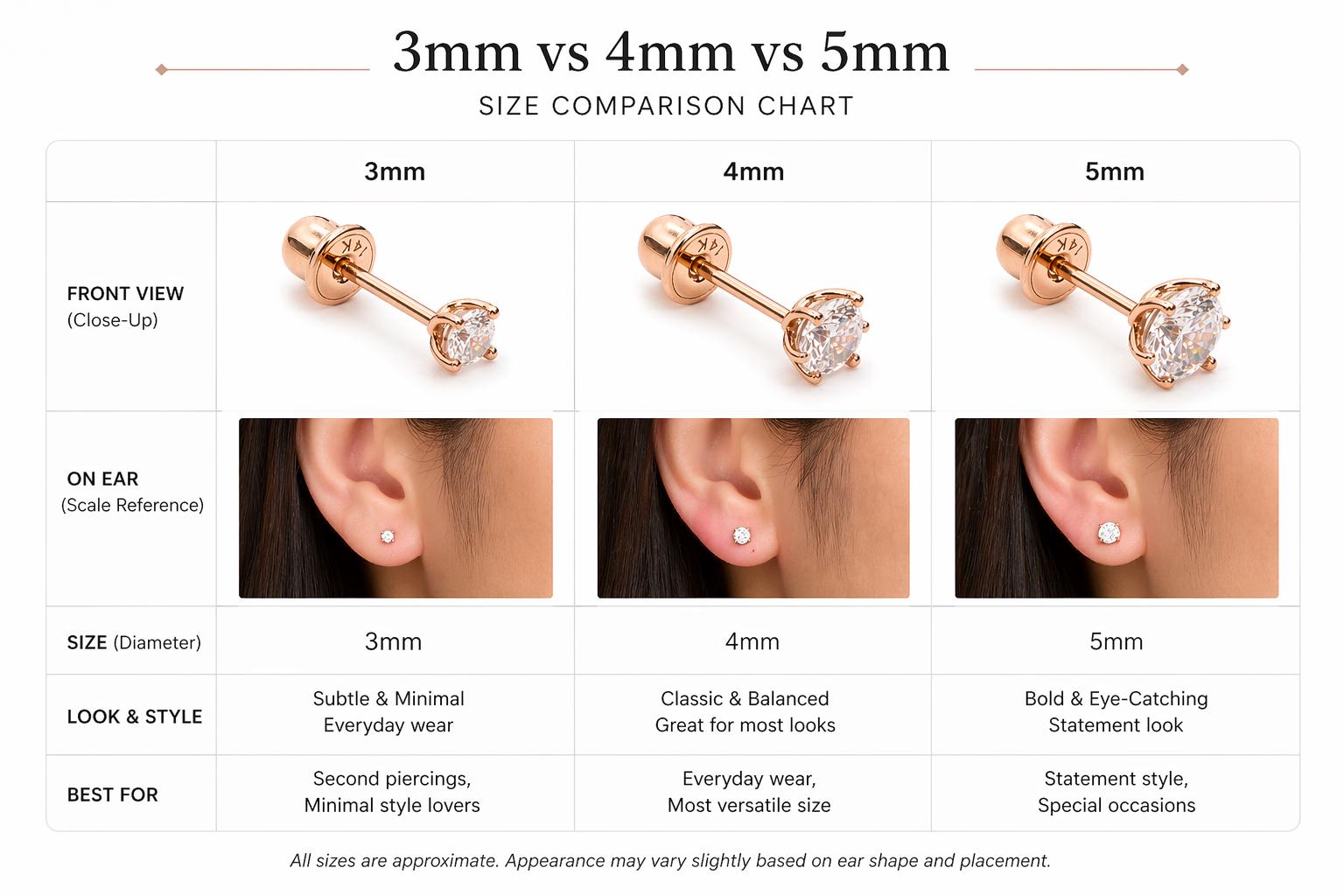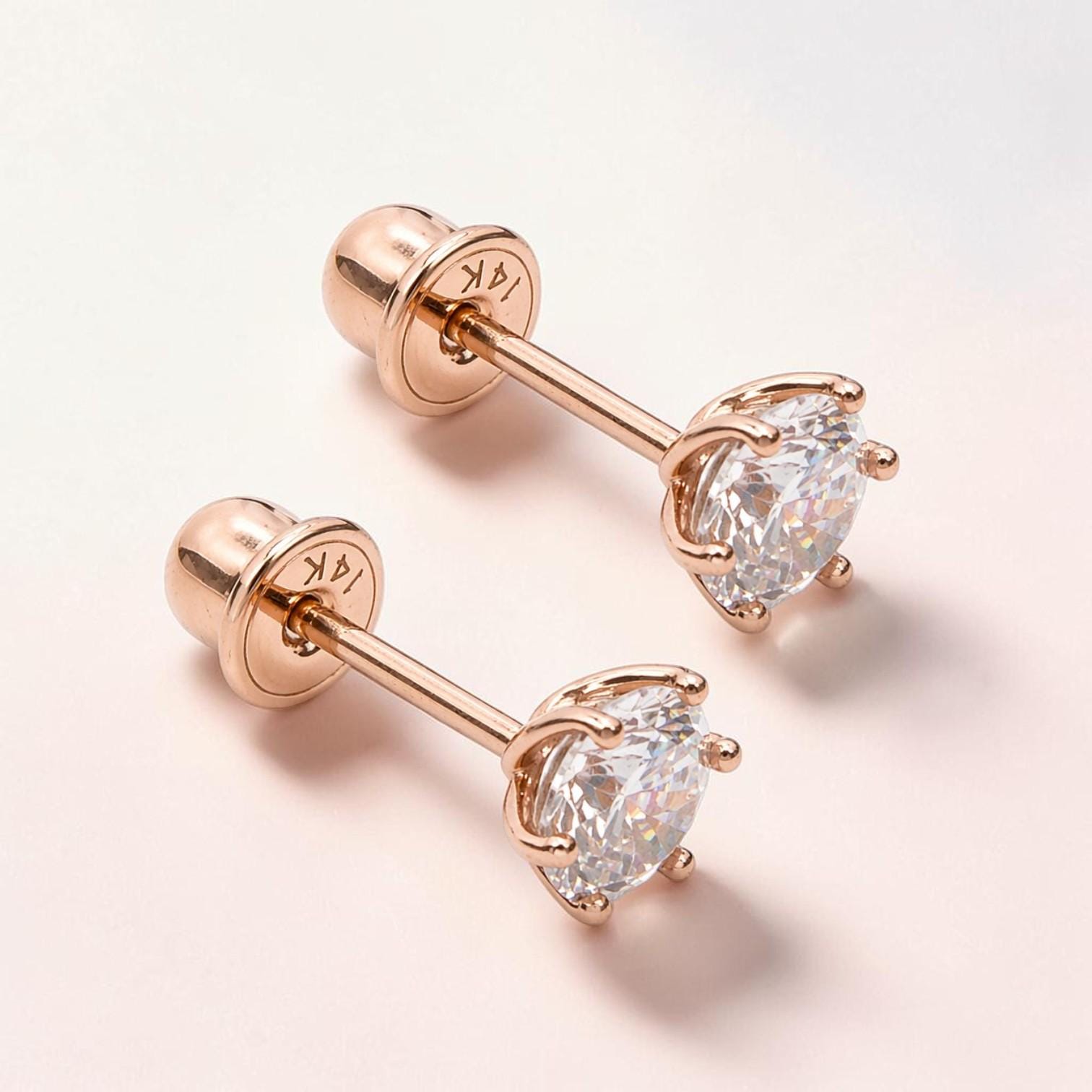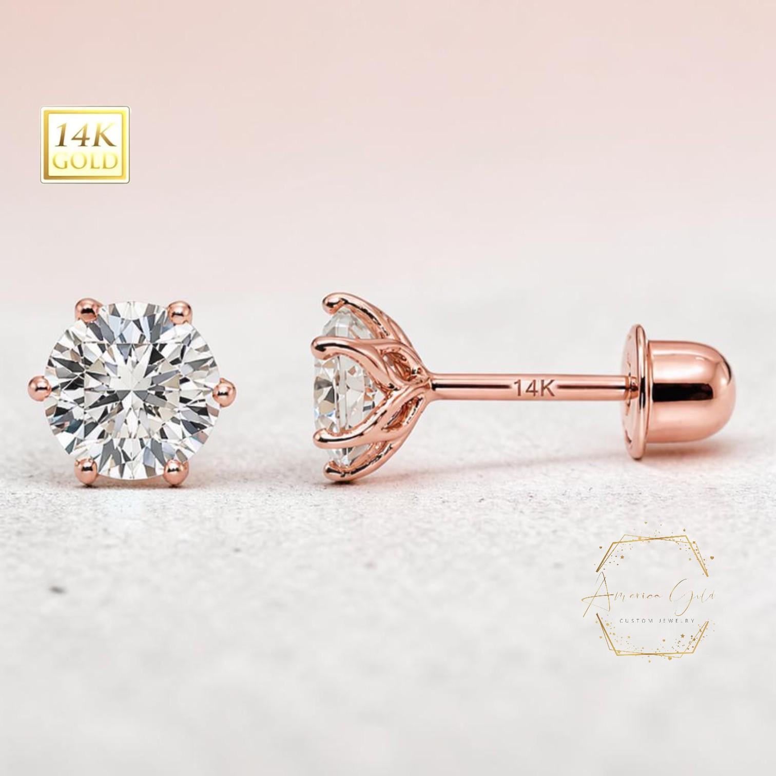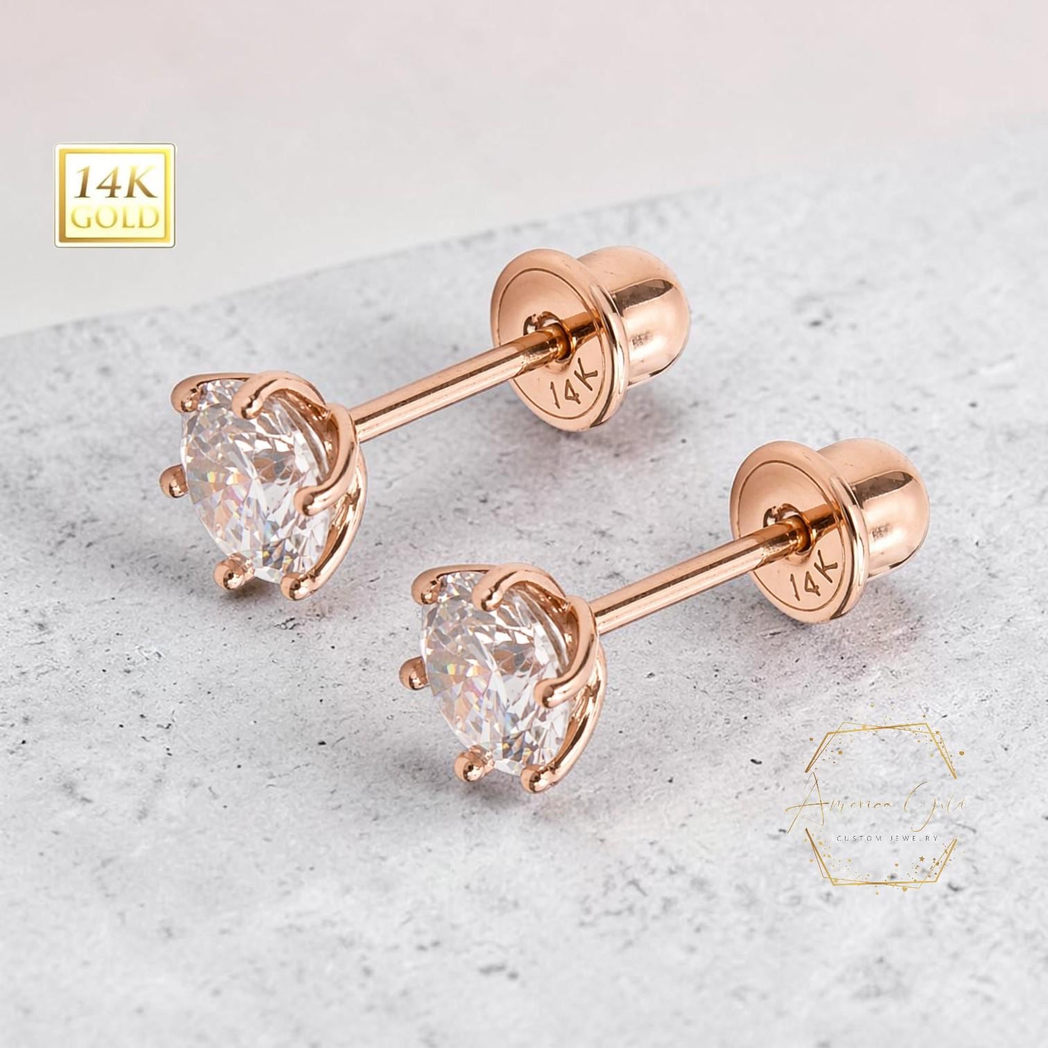 💎14K ROSE Gold with Flower 6 Prong Round Stud baby screw backing earrings 1 pair.
